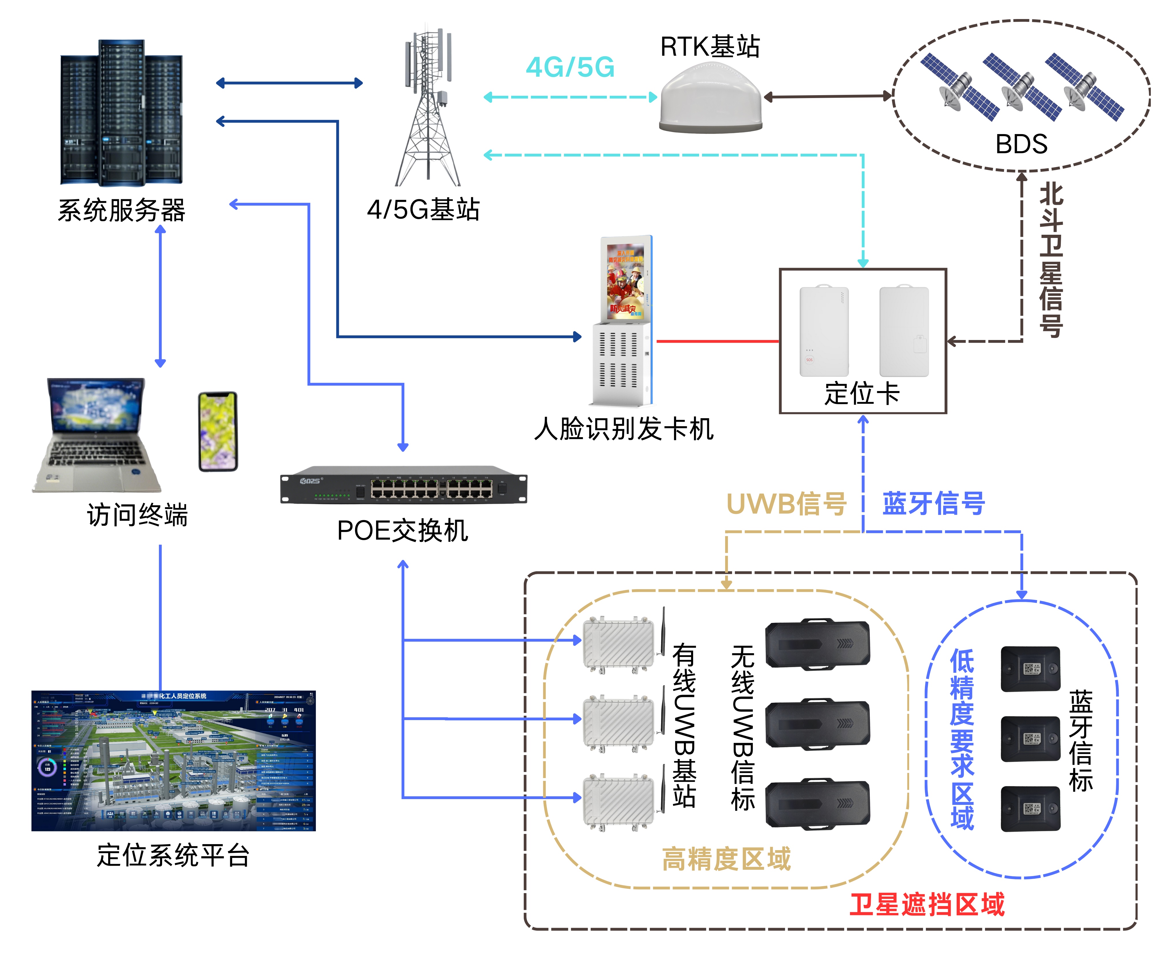 該多模融合高精度人員定位系統(tǒng)具有強(qiáng)大的適應(yīng)性:當(dāng)人員身處室外開(kāi)闊地帶時(shí),RTK技術(shù)借助衛(wèi)星信號(hào),可實(shí)現(xiàn)亞米級(jí)精準(zhǔn)定位;一旦進(jìn)入室內(nèi)或信號(hào)遮擋區(qū)域,系統(tǒng)會(huì)迅速切換至UWB與藍(lán)牙協(xié)同定位模式,確保定位精度不受環(huán)境影響。同時(shí),依托4G/5G通信網(wǎng)絡(luò),定位數(shù)據(jù)能實(shí)時(shí)同步至管理平臺(tái),支持人員/車(chē)輛精準(zhǔn)實(shí)時(shí)定位、歷史軌跡回放、電子圍欄、智能預(yù)警等功能,為企業(yè)安全生產(chǎn)和精細(xì)化管理提供了堅(jiān)實(shí)的數(shù)據(jù)保障。
