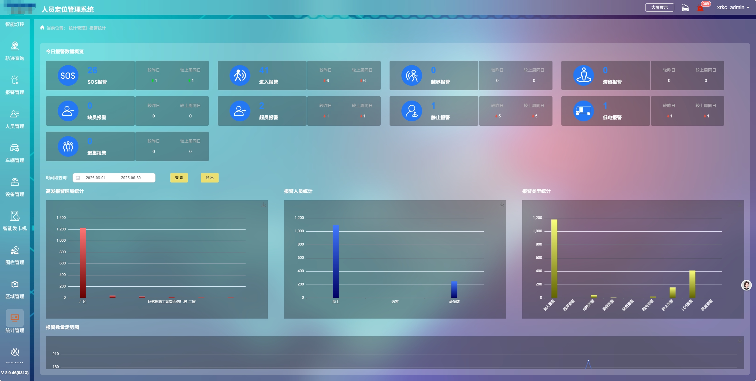 新銳科創人車定位系統與考勤平臺深度連接,實現自動化考勤管理。人員進入施工現場時,系統通過發卡機識別并記錄進入時間,離開時同樣記錄,精準生成考勤報表,杜絕代打卡等違規行為。同時,系統通過分析人員在不同工作區域的停留時間、工作軌跡等數據,為績效考核提供客觀依據。