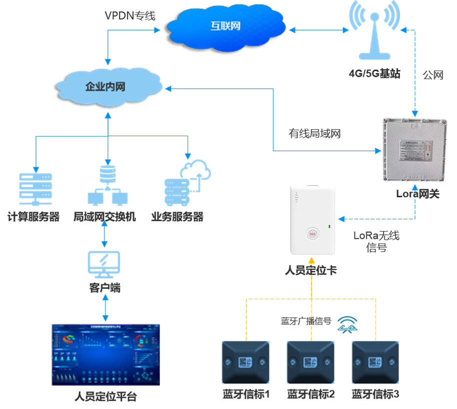 作為高精度人員定位系統服務商,新銳科創自主研發了藍牙+LoRa融合定位系統,該定位系統基于藍牙信標、定位卡、 LoRa網關進行定位,藍牙主要負責位置服務,LoRa主要負責數據傳輸。兩者各自充分發揮自己的優勢,從而實現低成本、易部署的綜合人員定位解決方案。新銳科創藍牙+ LoRa定位系統拓撲圖如下: